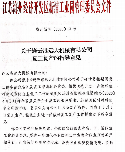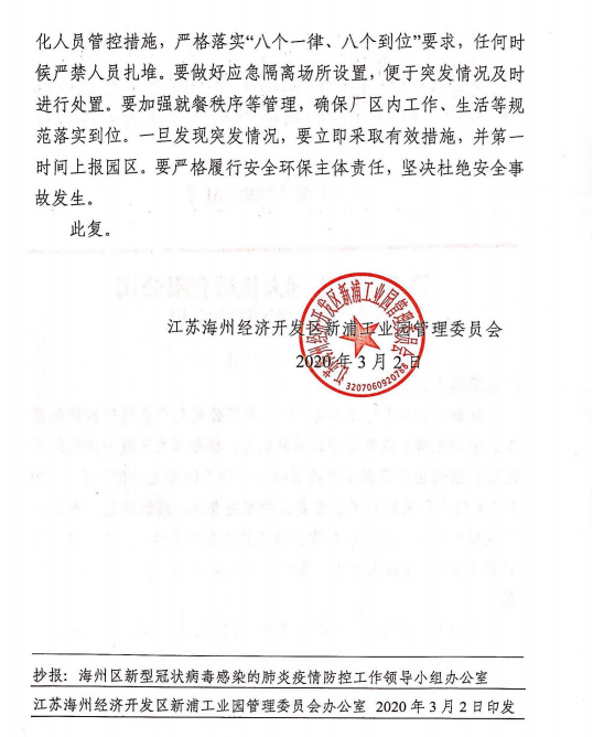 在前期的精心準備下,我公司已于3月1日通過疫情防控、安全生產(chǎn)、環(huán)保生產(chǎn)三項驗收,3月2日獲得復(fù)工批文并于今日正式復(fù)工。公司將強化底線思維,全面落實好國家和省、市、區(qū)防疫工作的相關(guān)要求。在扎實做好各項防控措施的基礎(chǔ)上,堅決杜絕疫情的發(fā)生。