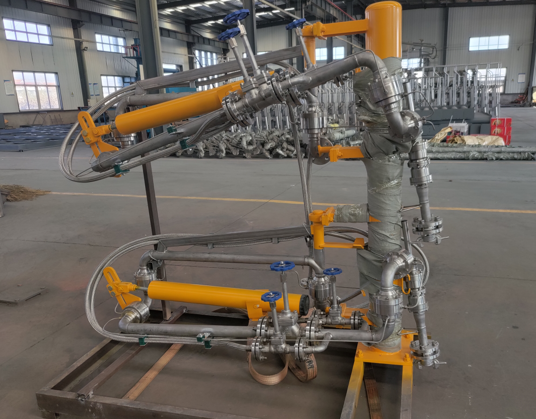 LNG、乙烯裝卸車臂的主要功能用于在罐車和管線間建立通道,完成主要的裝卸車功能;另外與回收裝置相聯(lián),用于平衡罐車內(nèi)壓力。低溫裝車臂主要分為氣相和液相兩條臂,兩條臂共同裝在一個立柱上。實現(xiàn)低溫介質(zhì)的裝卸車和回氣補(bǔ)氣,每個獨立的裝卸臂分為內(nèi)臂、外臂及和槽車連接的前部外伸臂。在裝卸臂的外臂上一般設(shè)立用于主管線關(guān)斷的球閥及在兩邊用于氮氣置換的旁路球閥,外臂有一彈簧平衡系統(tǒng)用來平衡外臂、外伸臂的重量,便于操作裝車。