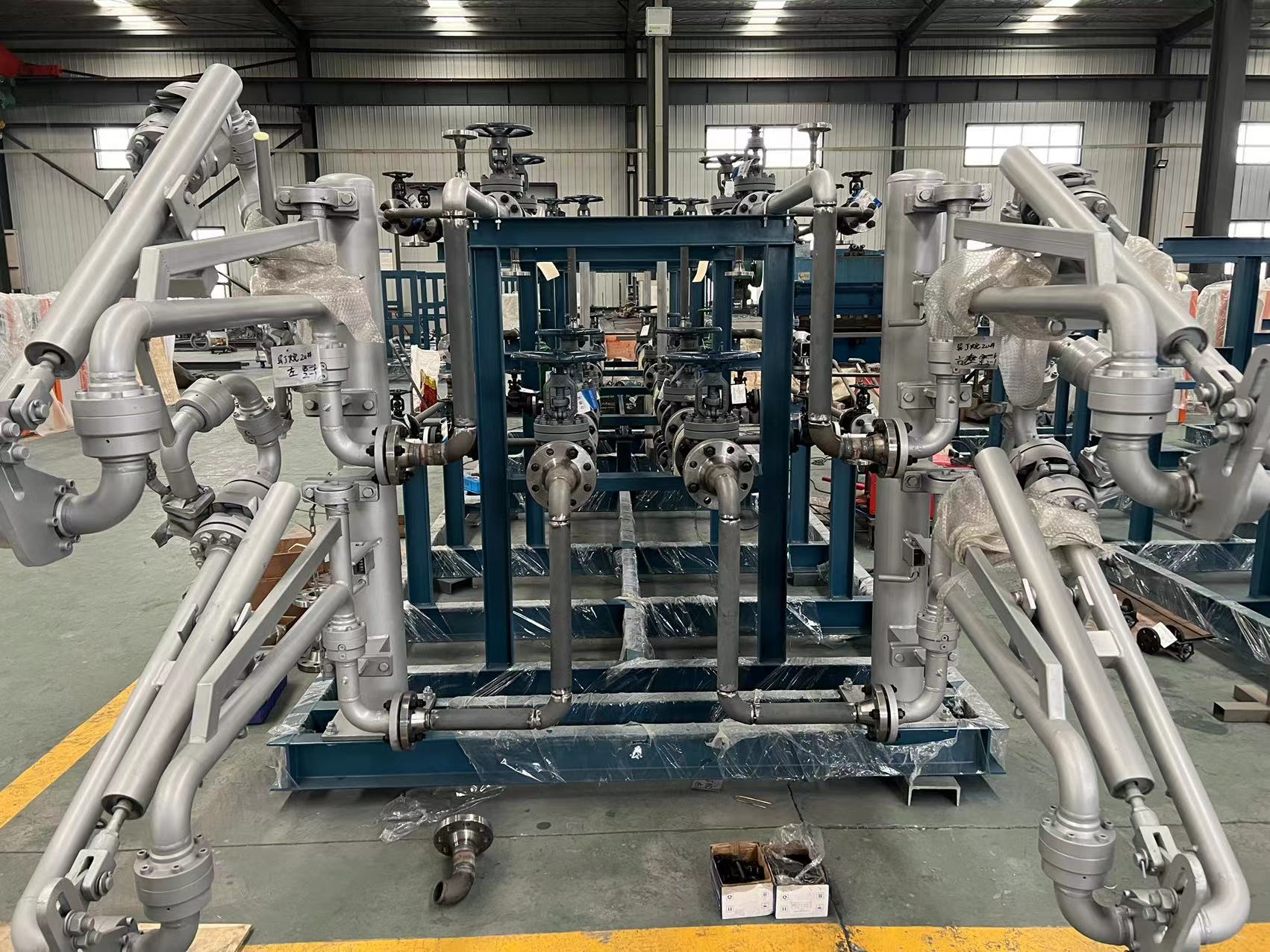 液化烴類介質(zhì)槽車裝車系統(tǒng)比油品槽車裝車系統(tǒng)復(fù)雜,現(xiàn)場(chǎng)組配裝車系統(tǒng),安裝和調(diào)試周期長,質(zhì)量不穩(wěn)定。為克服以上缺點(diǎn),在工廠內(nèi),將裝車系統(tǒng)的儀表和設(shè)備集成在一個(gè)橇裝架上,并完成電氣安裝、強(qiáng)度試驗(yàn)和低溫測(cè)試等,裝車橇到達(dá)用戶裝車現(xiàn)場(chǎng)后,接地角螺栓,連接工藝管線、通訊和供電線路就可以使用。結(jié)合液化烴類介質(zhì)裝車橇技術(shù)特點(diǎn),對(duì)液化烴裝車系統(tǒng)中的設(shè)計(jì)數(shù)據(jù)、功能要求、操作方法進(jìn)行敘述,綜合國內(nèi)裝車系統(tǒng)在使用中出現(xiàn)的問題提出了解決辦法。以下為公司近期液化烴類裝車撬的生產(chǎn)現(xiàn)場(chǎng)。